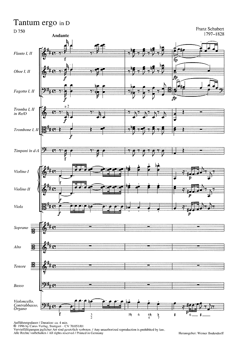 Tantum ergo in D (Chor SATB; 2 Flöten; 2 Oboen; 2 Fagotte; 2 Trompeten in Bb; 2 Posaunen; Pauken; 2 Violinen; Viola; Generalbass), Orgelauszug