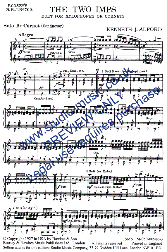 Zusatzinfo/Inhalt "Two Imps" von Kenneth J. Alford ist eine brillante und unterhaltsame Komposition, die sowohl für Xylophon- als auch für Kornettsolisten geeignet ist. Das Stück zeigt Alford von einer anderen Seite als seine berühmten Märsche und hebt seine Fähigkeit hervor, humorvolle und technisch anspruchsvolle Musik zu schreiben. "Two Imps" bleibt ein fester Bestandteil des Repertoires für Blasorchester und Brassbands und begeistert Musiker und Zuhörer gleichermaßen durch seinen spritzigen Charakter und die virtuosen Anforderungen an die Solisten.