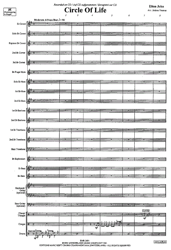 Zusatzinfo/Inhalt „The Lion King“ (1994) ist ein prägender Animationsfilm mit einer von afrikanischen Mythen inspirierten Handlung. Der Song „Circle of Life“ (Elton John/Tim Rice) wurde zum weltweiten Klassiker und erreichte Platz 1 der US-Charts. Jérôme Thomas arrangierte das Stück für Blasorchester und Brassbands, wobei er die orchestralen Elemente und afrikanischen Rhythmen authentisch auf Blechbläser übertrug. Die Bearbeitung eignet sich durch ihre musikalische Ansprüchlichkeit und emotionale Wirkung ideal für Konzertprogramme und bereichert das Repertoire um ein publikumswirksames Werk.