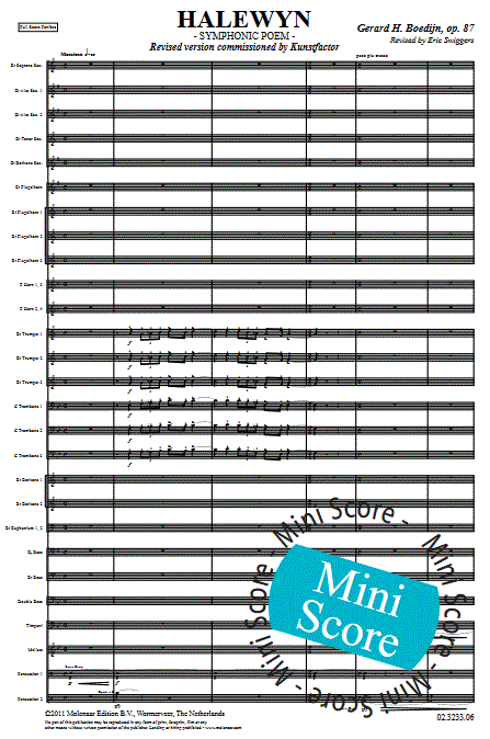 Über vier kernige Themen führt der Musikant und Zuhörer durch das Epos. Alle wichtigen Figuren oder Situationen besitzen ein eigenes Thema. Neben dem kernigen Halewijn-Motiv gibt es natürlich das Königstochter-Motiv in einem kontrastierenden Thema. In einem bestimmten Moment geht die Prinzessin, in ihrer schönsten Kleidung reitend auf dem besten Pferd, auf die Suche nach Herrn Halewijn. Im Wald treffen sie sich und reiten zusammen weiter. Die Reitmotive, die dazu gehören, sind äußerst deutlich. So als wir mittlerweile wissen, ist das Ende dieser Legende ein Sieg der Königstochter, was eine festliche Koda von diesem Musikwerk zur Folge hat. Molenaar bietet gute zweiundsiebzig Jahre nach dem Erscheinen dieser Komposition eine im Auftrag von 'Kunstfactor' durch Eric Swiggers vollständig revidierte Version an. Eine Komposition, die einen Platz in Ihrem Repertoire sehr sicher verdient hat.